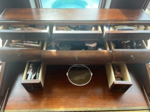 (3). Having decided I deserved a beautiful make-up table, I set about searching websites, craigslist, facebook marketplace until I found the perfect make-up table!!!!! I was shocked to find this desk for only $95, a fraction of the cost of those Amazon Make-up organizers. This one looked like an antique, but as it had a hidden electrical plug, so it’s not technically an antique. My beautiful, petite secretary desk has tons of draws to organize all my make-up. And, best of all? Everything seemed to fit perfectly!